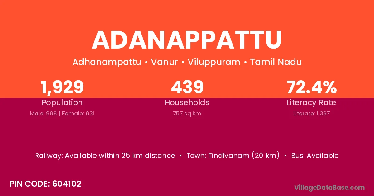 Tindivanam (20 km) is the nearest town to Adanappattu village for major economic activities and is located approximately 20 km away.