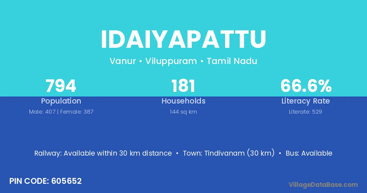 Tindivanam (30 km) is the nearest town to Idaiyapattu village for major economic activities and is located approximately 30 km away.