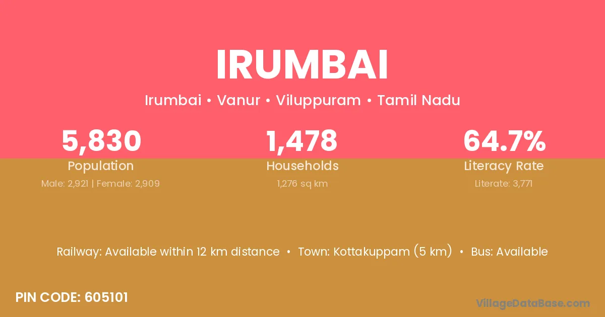 Kottakuppam (5 km) is the nearest town to Irumbai village for major economic activities and is located approximately 5 km away.