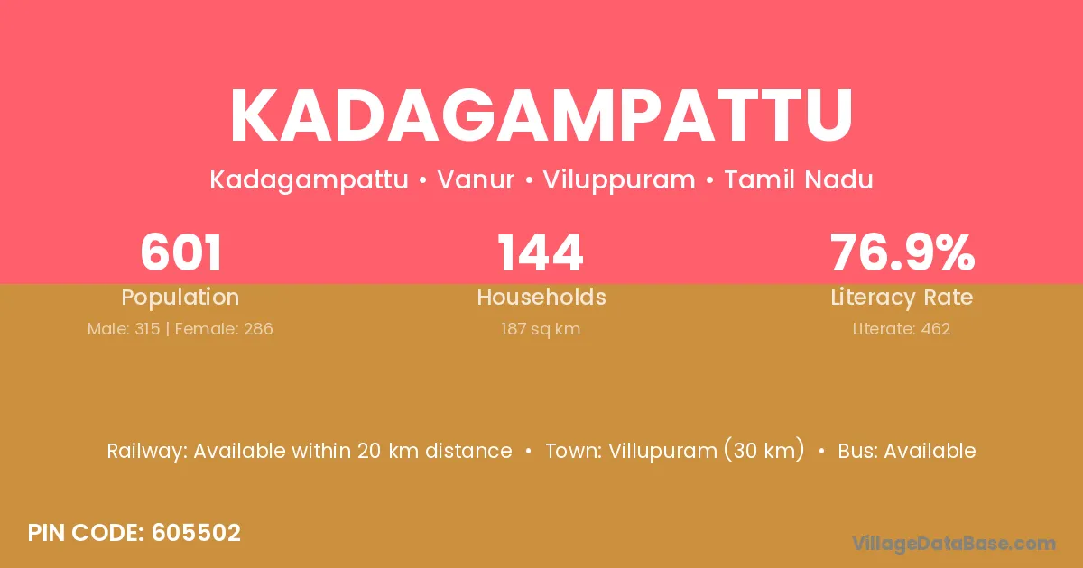 Villupuram (30 km) is the nearest town to Kadagampattu village for major economic activities and is located approximately 30 km away.