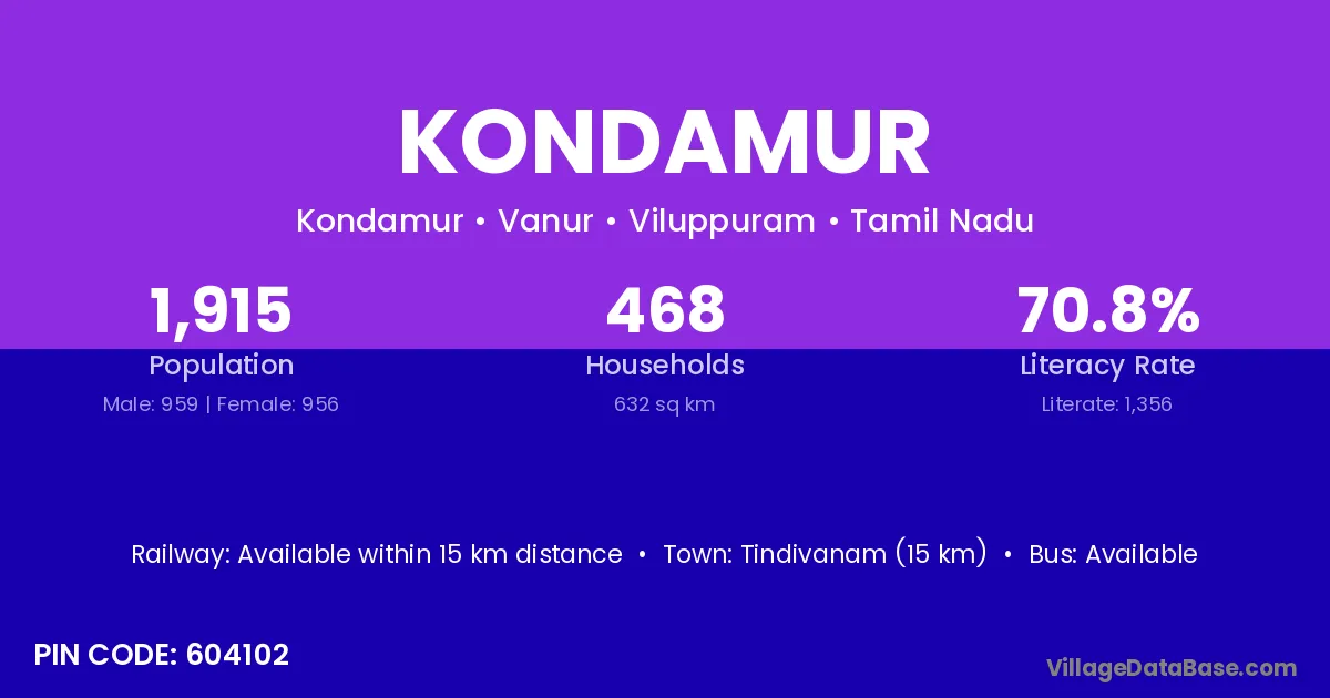 Tindivanam (15 km) is the nearest town to Kondamur village for major economic activities and is located approximately 15 km away.