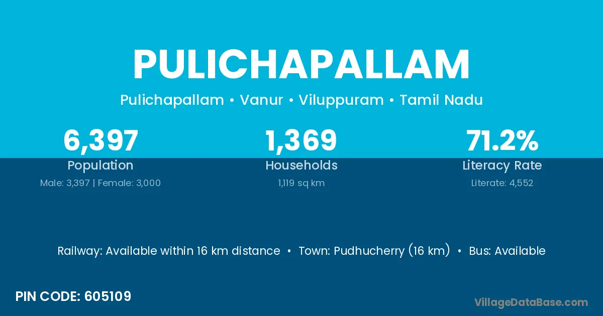 Pudhucherry (16 km) is the nearest town to Pulichapallam village for major economic activities and is located approximately 16 km away.
