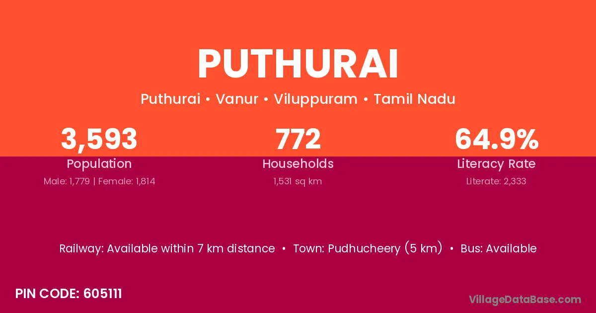 Pudhucheery (5 km) is the nearest town to Puthurai village for major economic activities and is located approximately 5 km away.