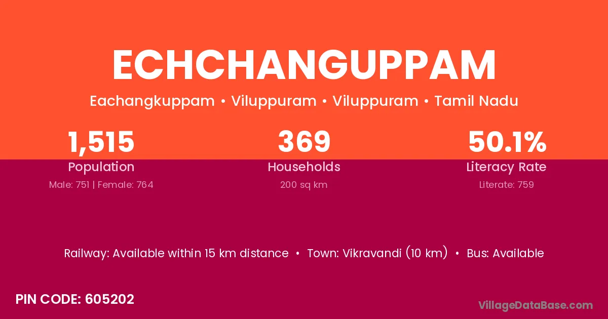 Echchanguppam village has a total population of 1,515 people, of which 751 are males and 764 are females.