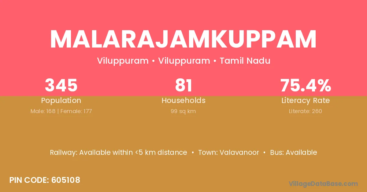 Malarajamkuppam village has a total population of 345 people, of which 168 are males and 177 are females.