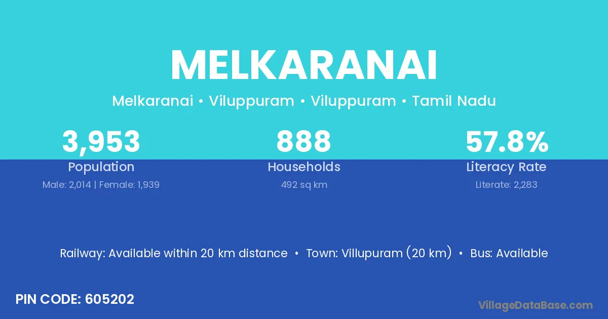 Villupuram (20 km) is the nearest town to Melkaranai village for major economic activities and is located approximately 20 km away.