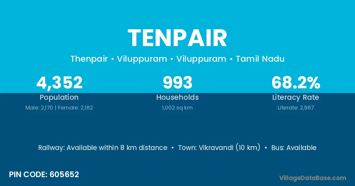 Vikravandi (10 km) is the nearest town to Tenpair village for major economic activities and is located approximately 10 km away.
