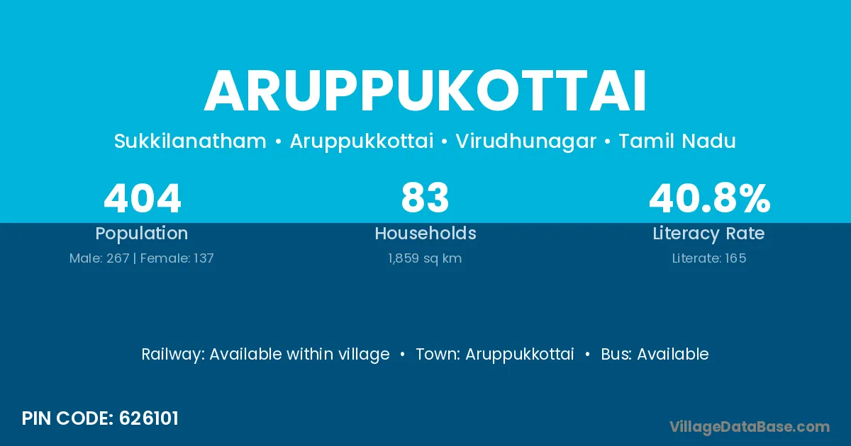 Aruppukottai village has a total population of 404 people, of which 267 are males and 137 are females.