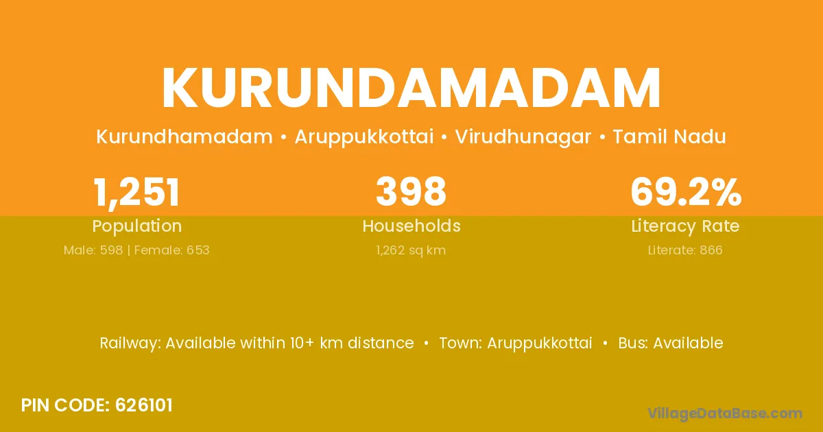 Kurundamadam village has a total population of 1,251 people, of which 598 are males and 653 are females.