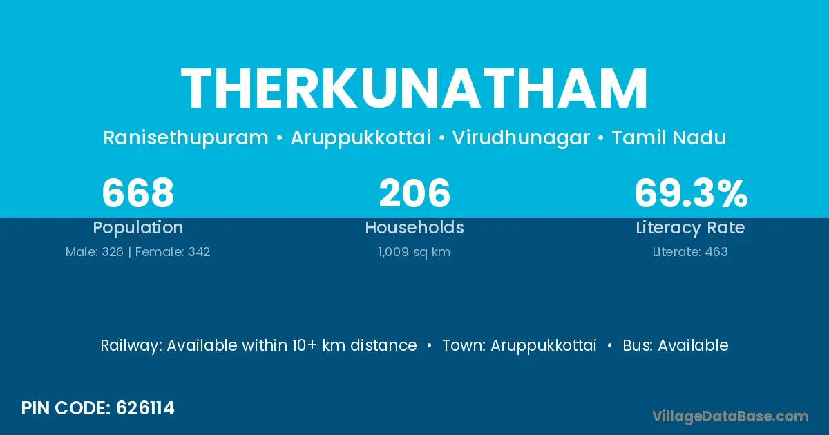 Aruppukkottai is the nearest town to Therkunatham village for major economic activities