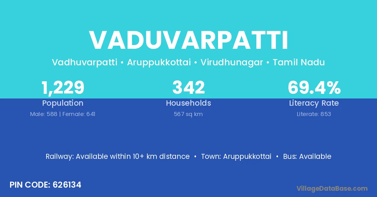 Vaduvarpatti village has a total population of 1,229 people, of which 588 are males and 641 are females.