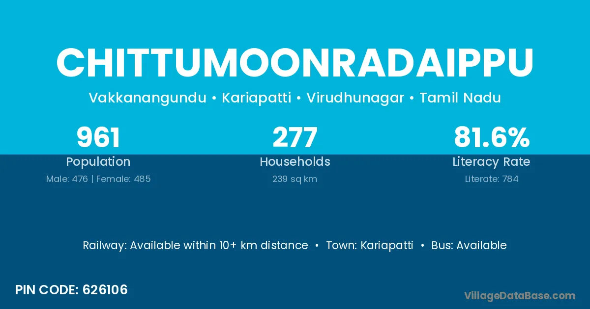 Chittumoonradaippu village has a total population of 961 people, of which 476 are males and 485 are females.
