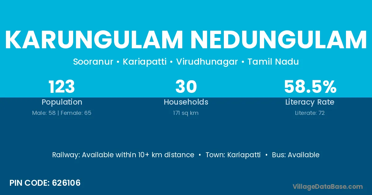 According to Census 2011 information, the village code of Karungulam Nedungulam village is 626106.