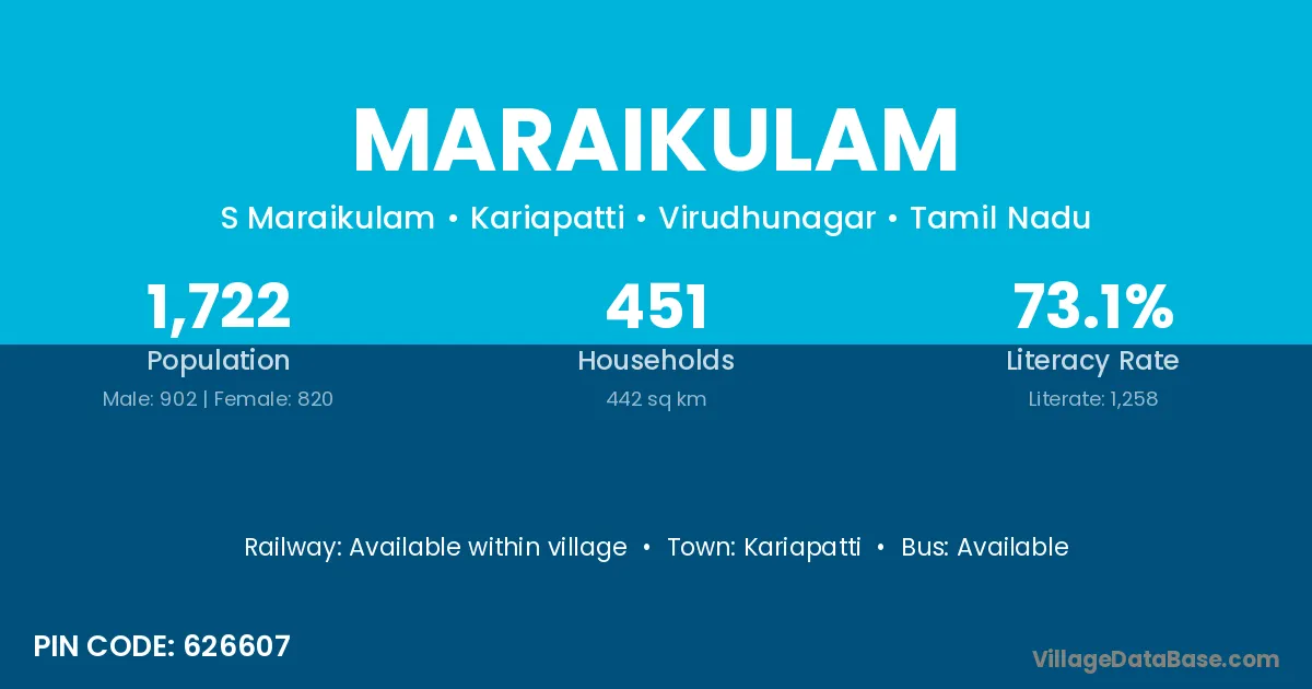 Maraikulam village has a total population of 1,722 people, of which 902 are males and 820 are females.
