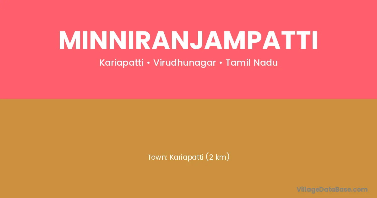 Kariapatti (2 km) is the nearest town to Minniranjampatti village for major economic activities and is located approximately 2 km away.