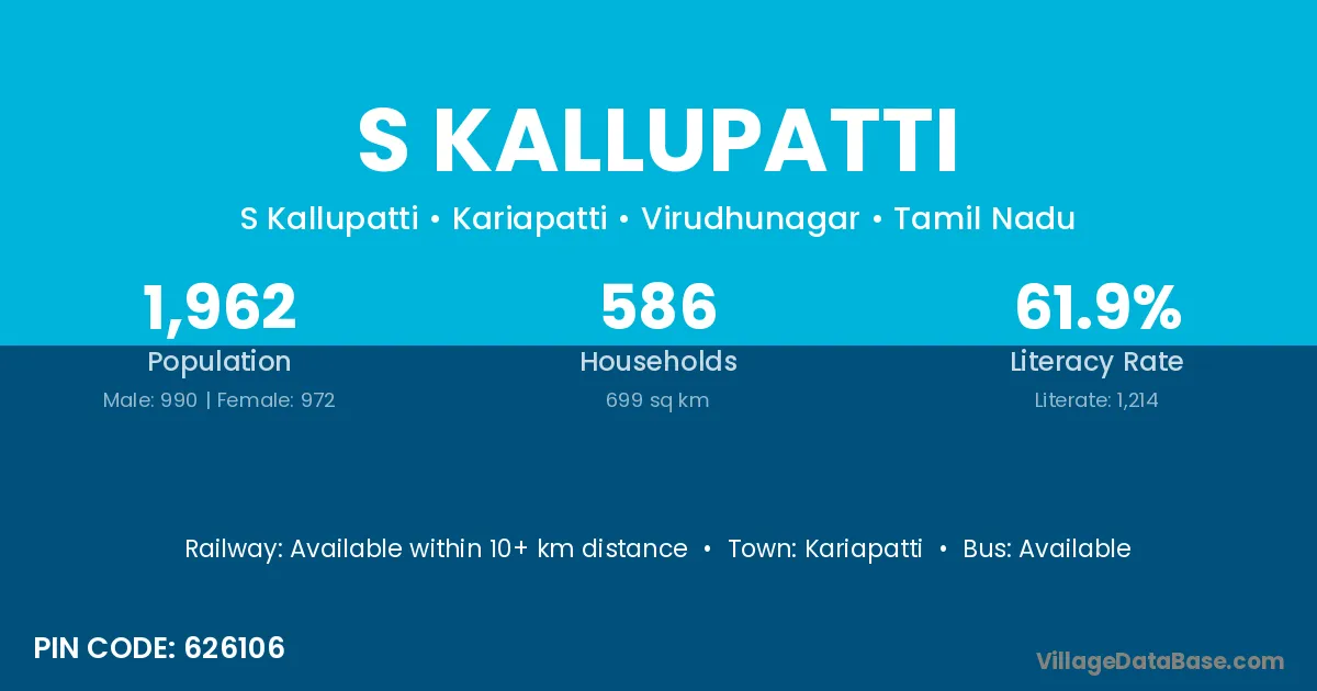 S Kallupatti village has a total population of 1,962 people, of which 990 are males and 972 are females.