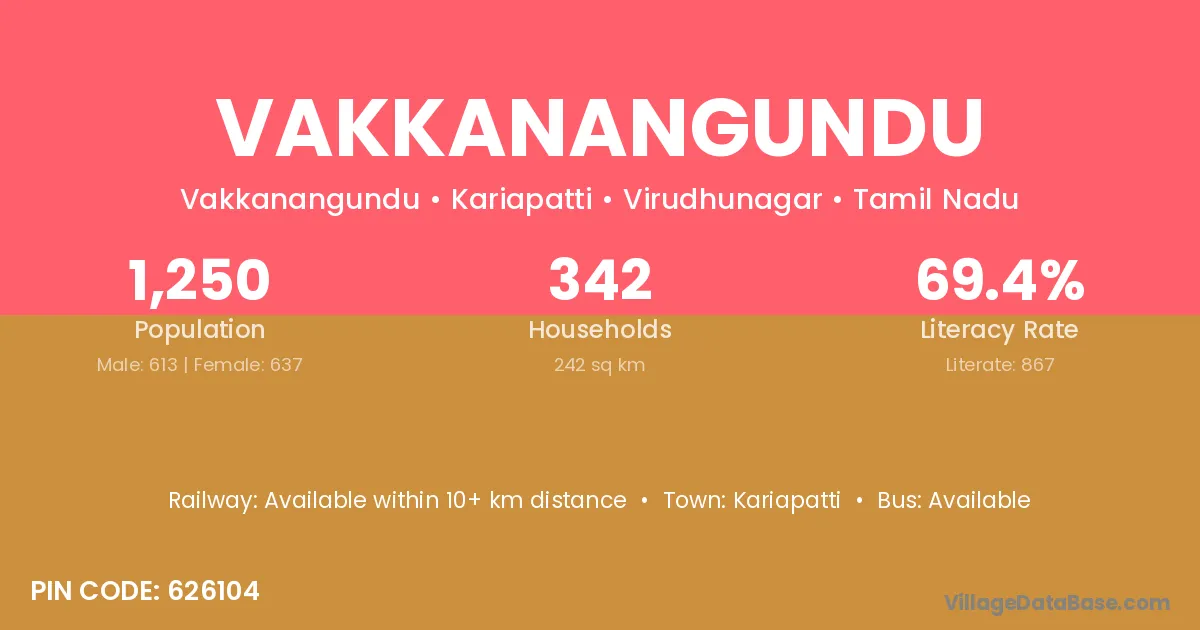 Vakkanangundu village has a total population of 1,250 people, of which 613 are males and 637 are females.