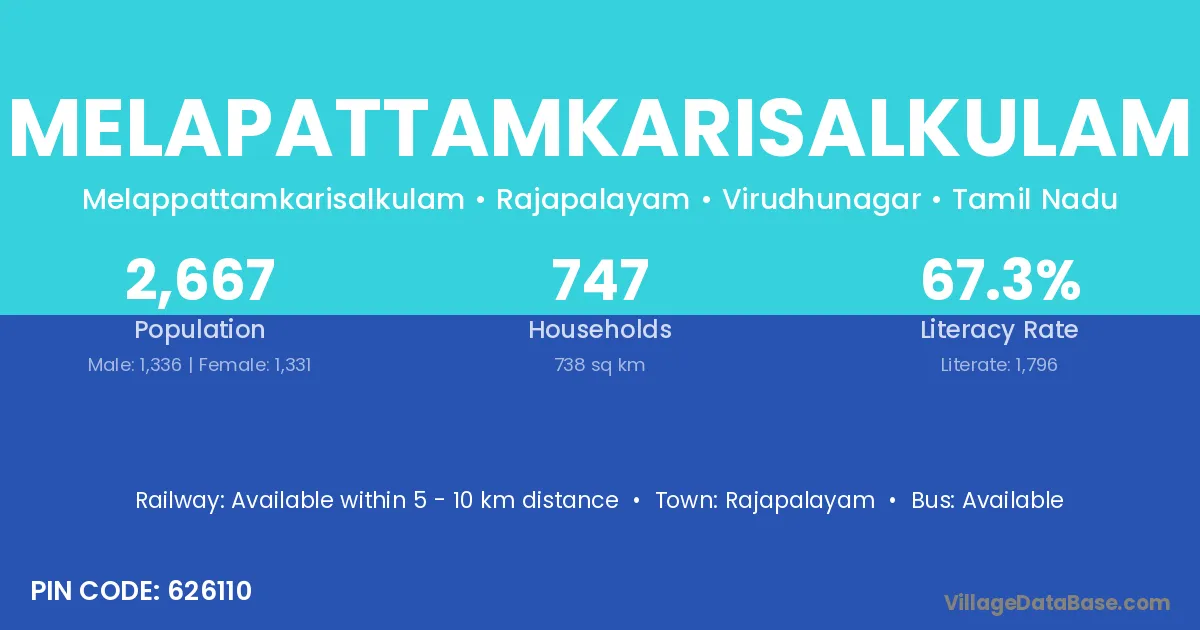 Melapattamkarisalkulam village has a total population of 2,667 people, of which 1,336 are males and 1,331 are females.