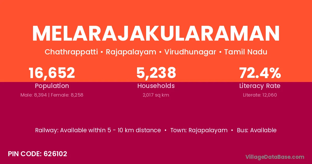 Melarajakularaman village has a total population of 16,652 people, of which 8,394 are males and 8,258 are females.