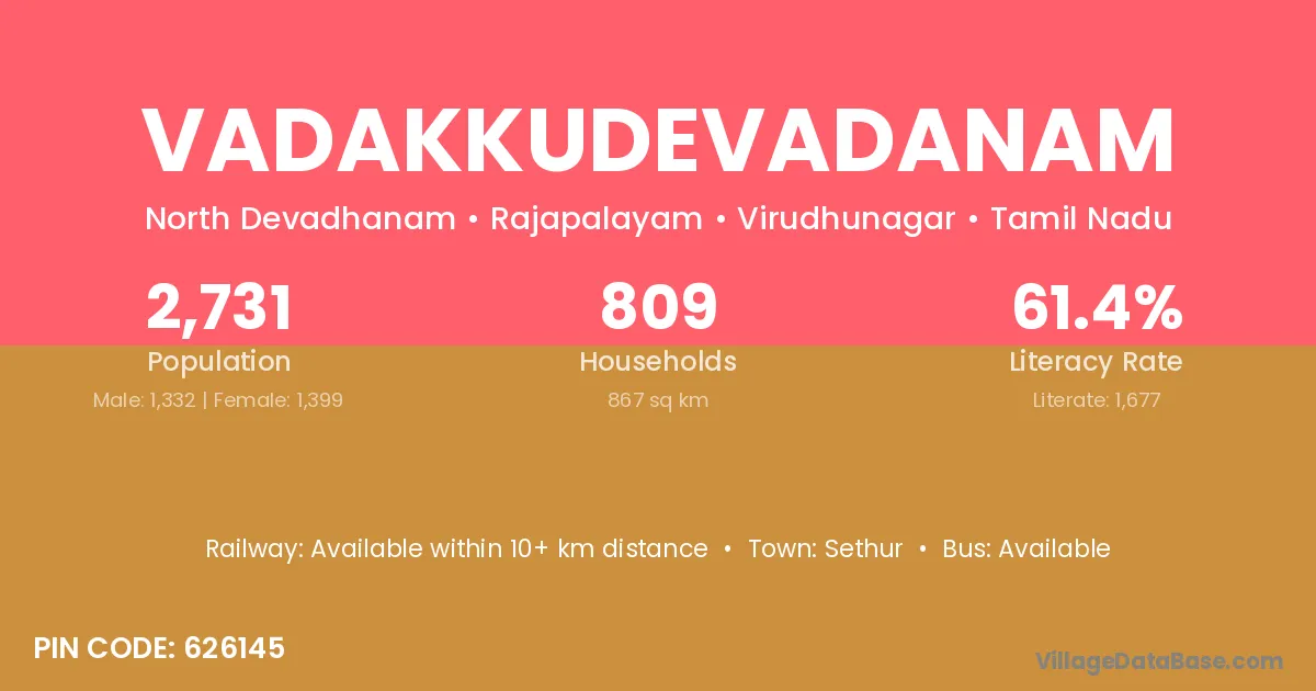 Vadakkudevadanam village has a total population of 2,731 people, of which 1,332 are males and 1,399 are females.