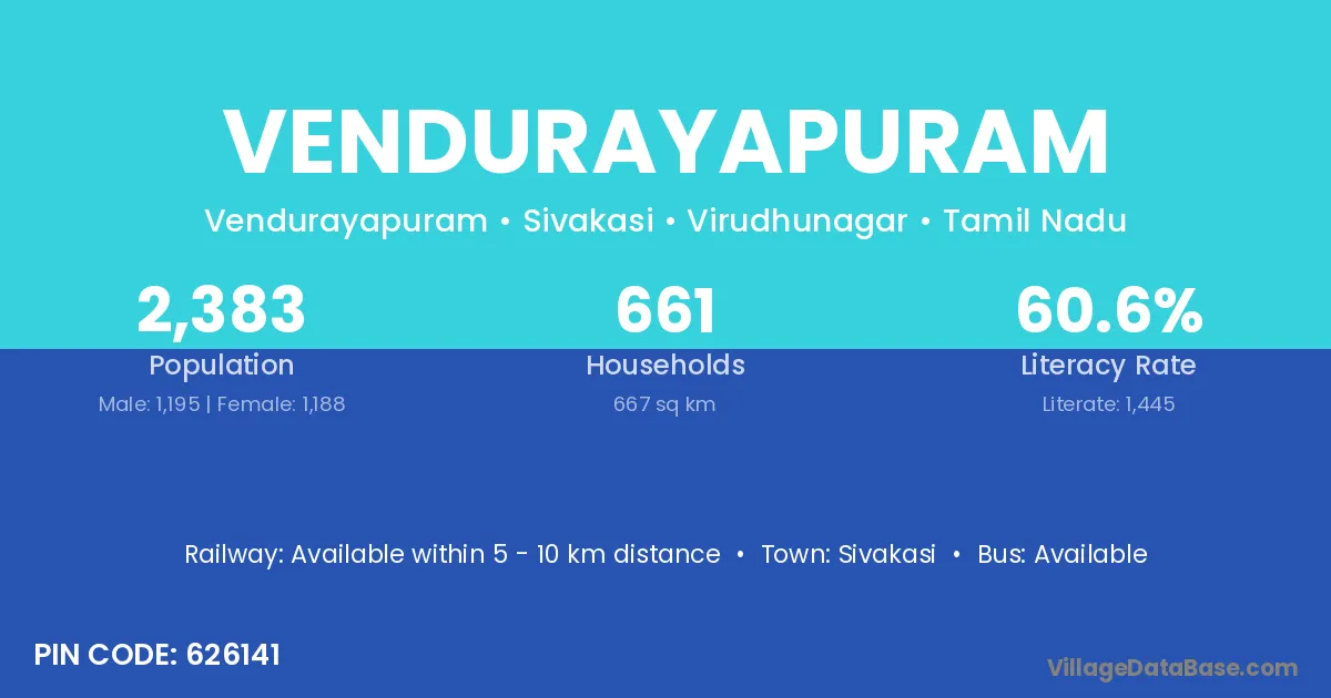 Sivakasi is the nearest town to Vendurayapuram village for major economic activities
