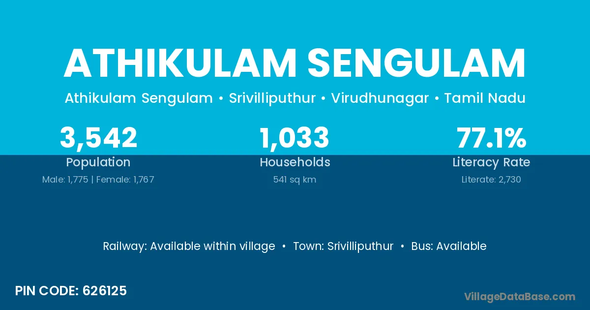 Athikulam Sengulam village has a total population of 3,542 people, of which 1,775 are males and 1,767 are females.