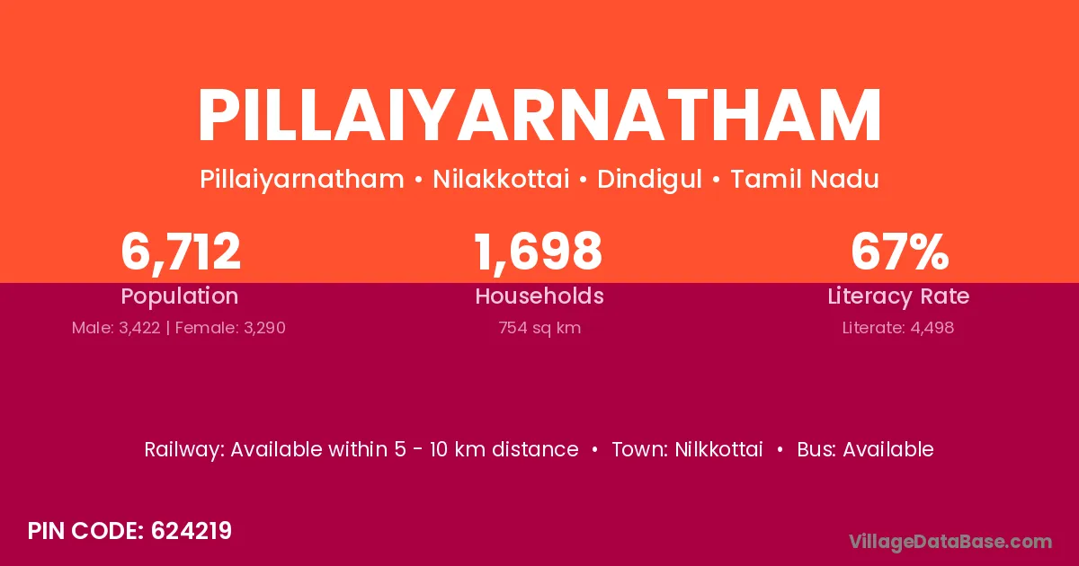 Pillaiyarnatham village has a total population of 3,800 people, of which 1,891 are males and 1,909 are females.