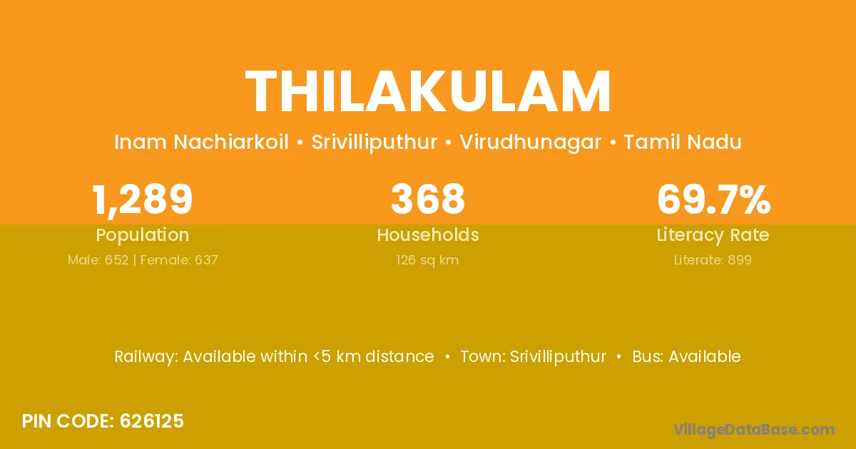 Thilakulam village has a total population of 1,289 people, of which 652 are males and 637 are females.