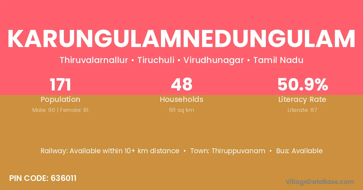 Karungulamnedungulam village has a total population of 171 people, of which 90 are males and 81 are females.