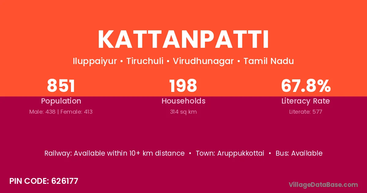 Kattanpatti village has a total population of 851 people, of which 438 are males and 413 are females.