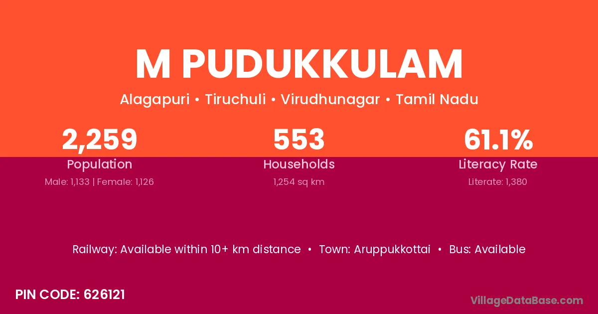 M Pudukkulam village has a total population of 2,259 people, of which 1,133 are males and 1,126 are females.