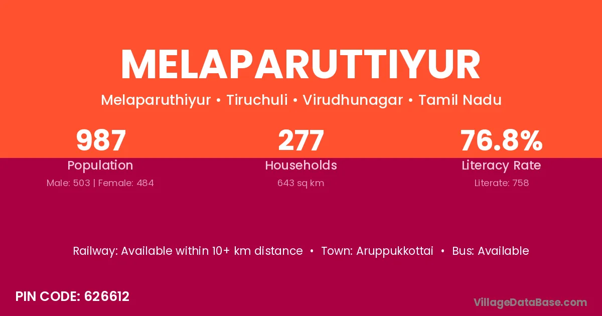 Melaparuttiyur village has a total population of 987 people, of which 503 are males and 484 are females.