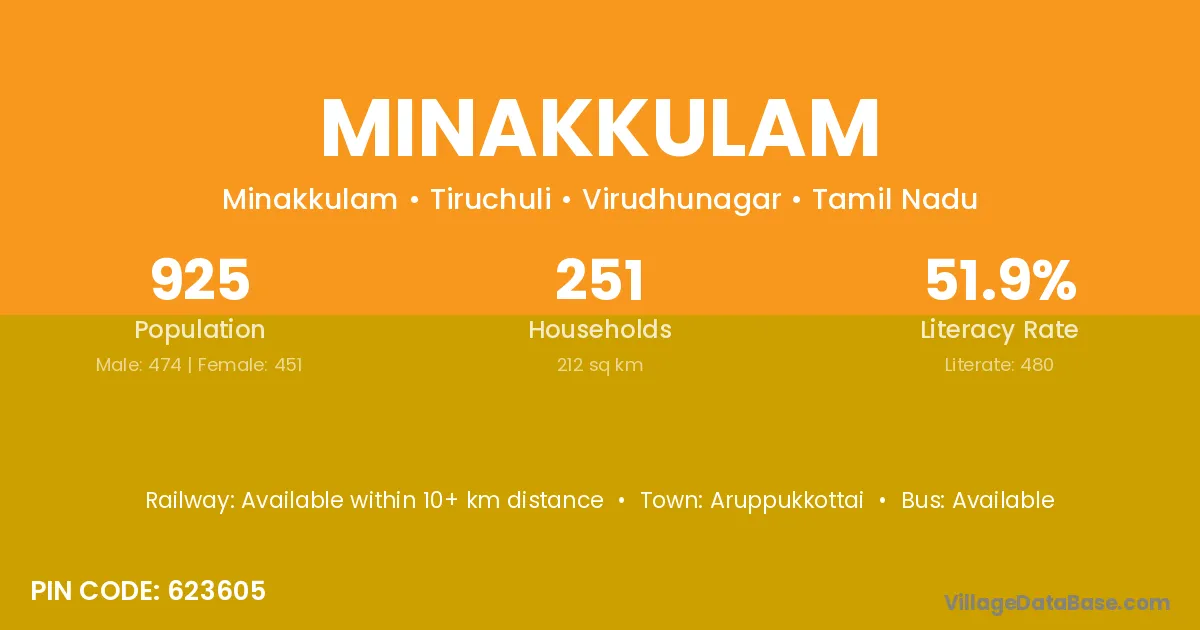 Minakkulam village has a total population of 925 people, of which 474 are males and 451 are females.