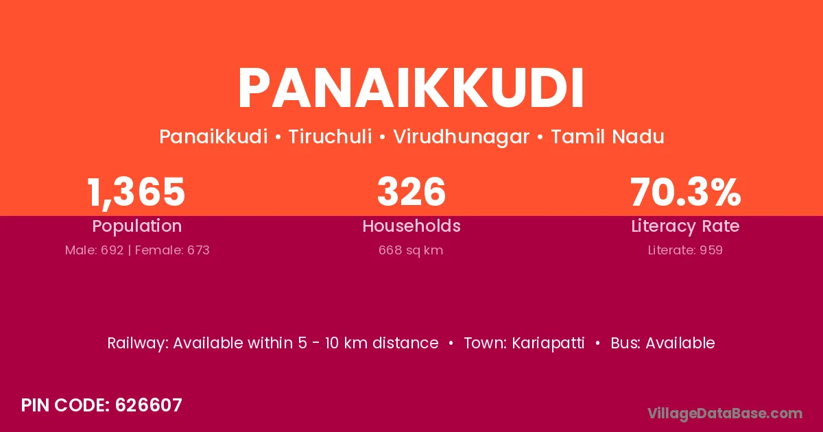 Panaikkudi village has a total population of 1,365 people, of which 692 are males and 673 are females.