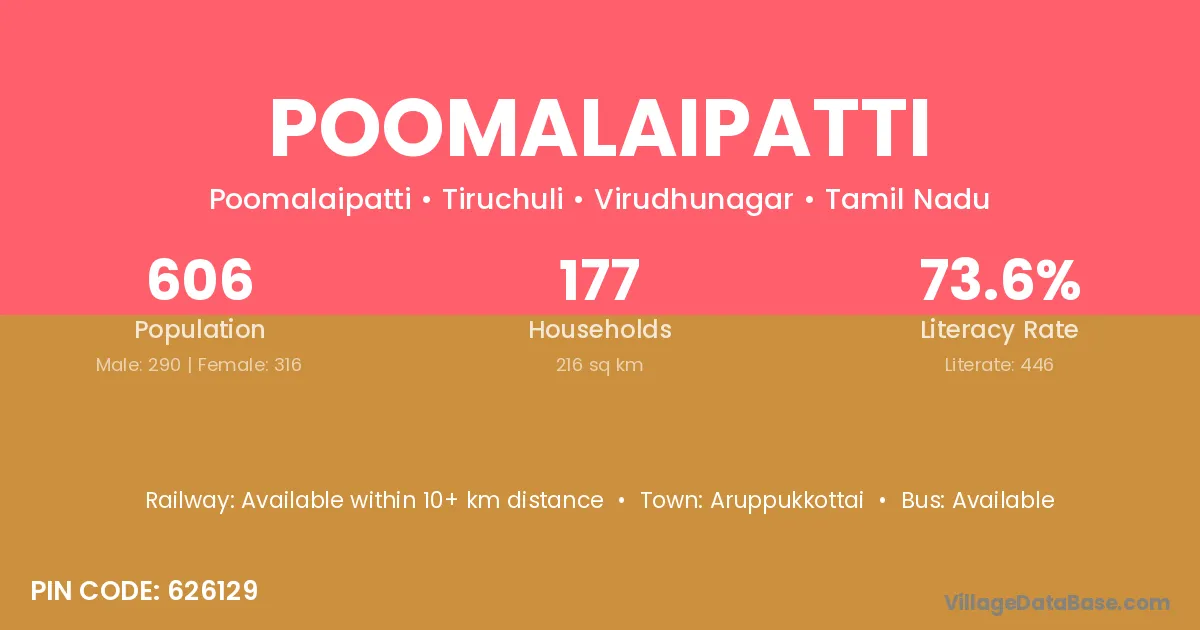 Poomalaipatti village has a total population of 606 people, of which 290 are males and 316 are females.