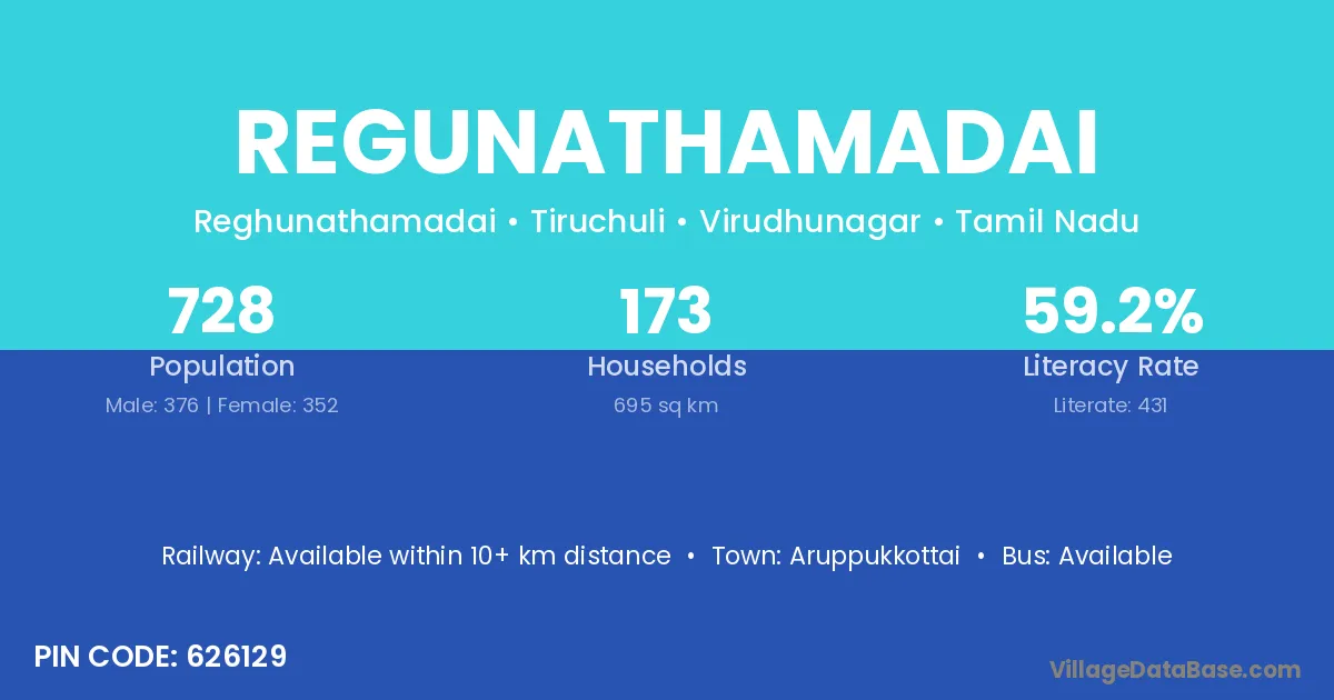 Regunathamadai village has a total population of 728 people, of which 376 are males and 352 are females.