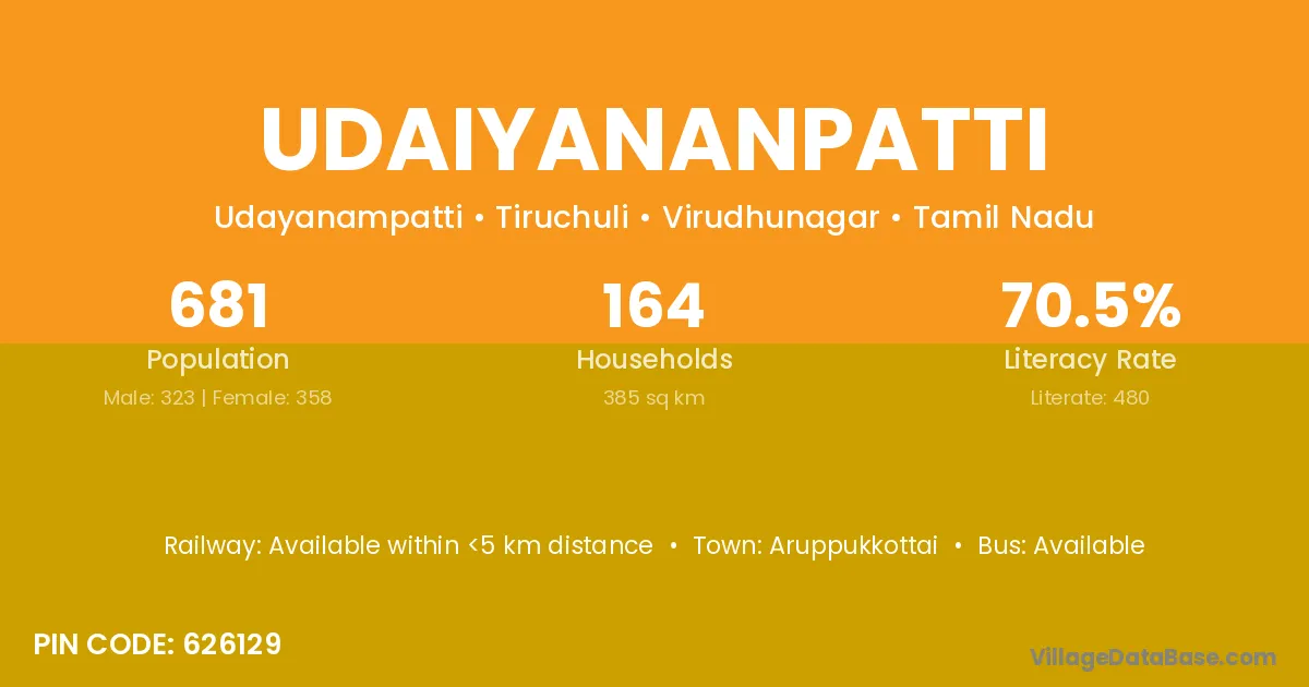 Udaiyananpatti village has a total population of 681 people, of which 323 are males and 358 are females.