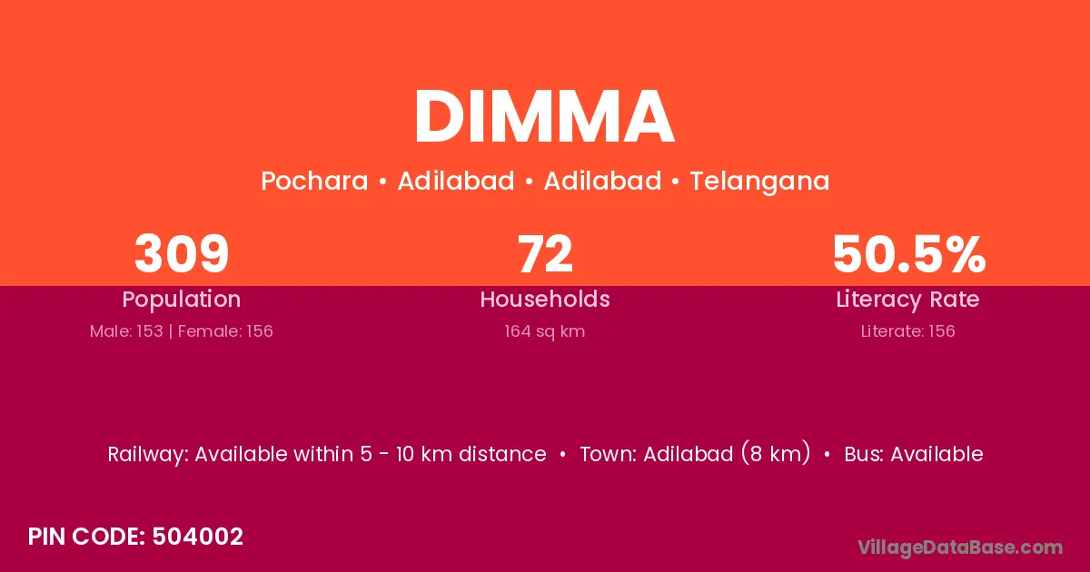 Adilabad (8 km) is the nearest town to Dimma village for major economic activities and is located approximately 8 km away.