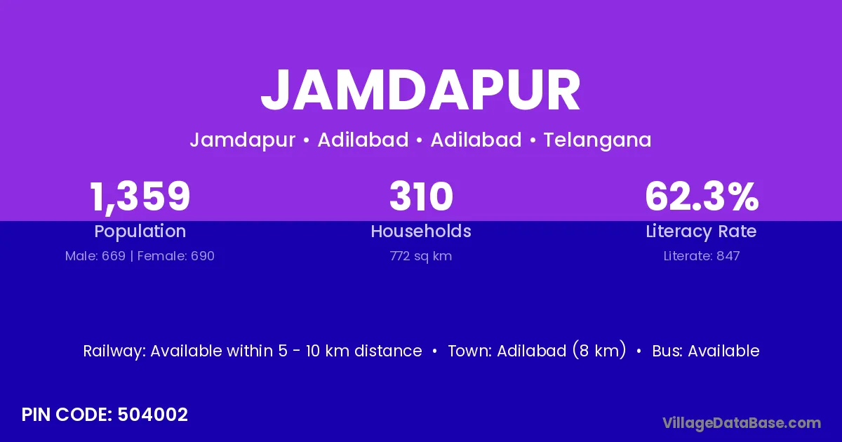 Adilabad (8 km) is the nearest town to Jamdapur village for major economic activities and is located approximately 8 km away.