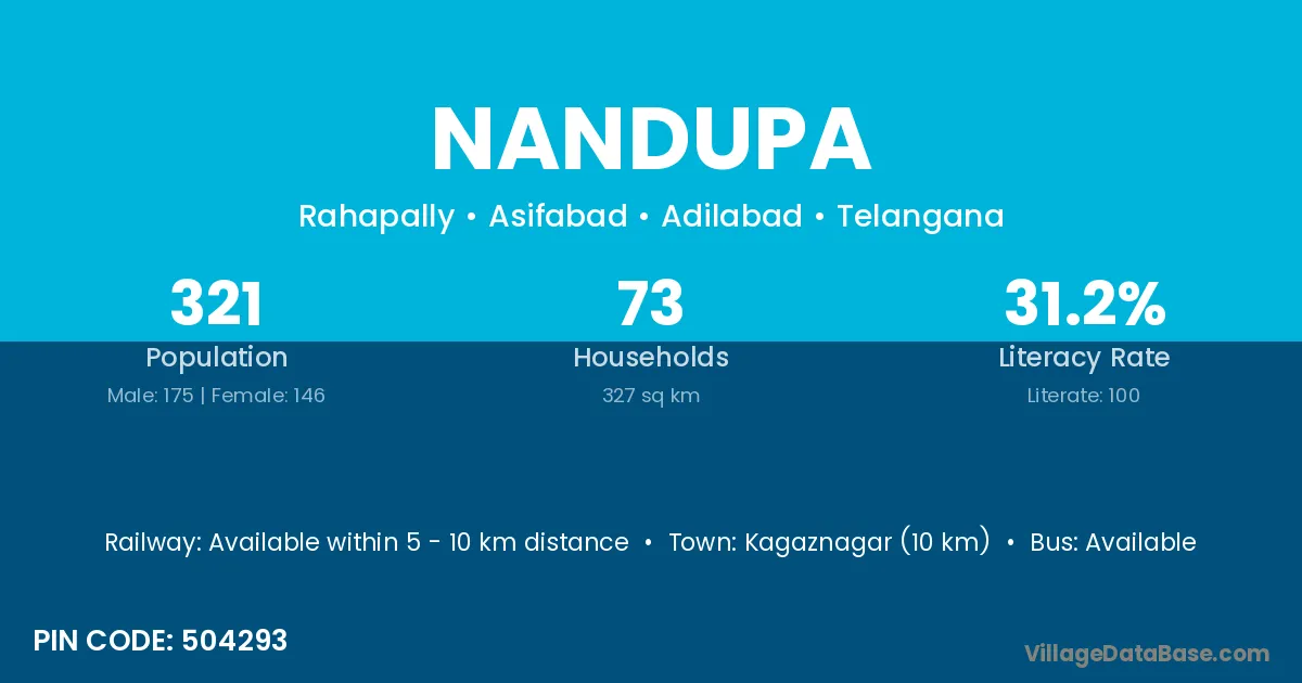 Kagaznagar (10 km) is the nearest town to Nandupa village for major economic activities and is located approximately 10 km away.
