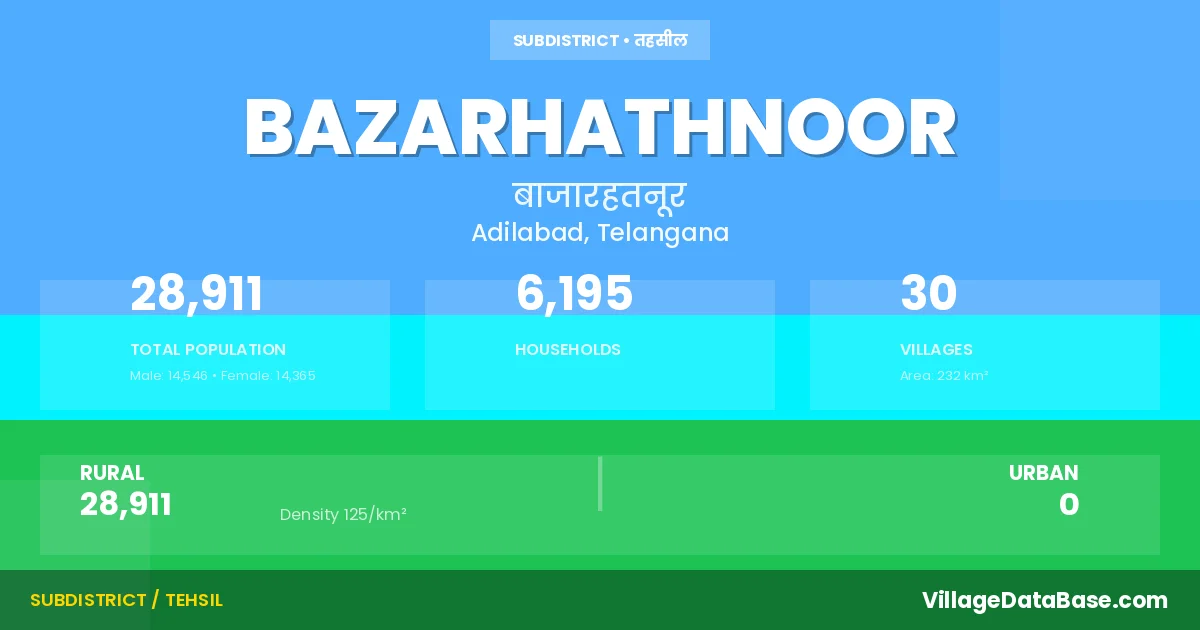 According to the 2011 census The total area of Bazarhathnoor Mandal is 232 km², with a population of 28911 people. The population density is 125 inhabitants per square kilometre, and there are approximately 6195 houses in the sub district.