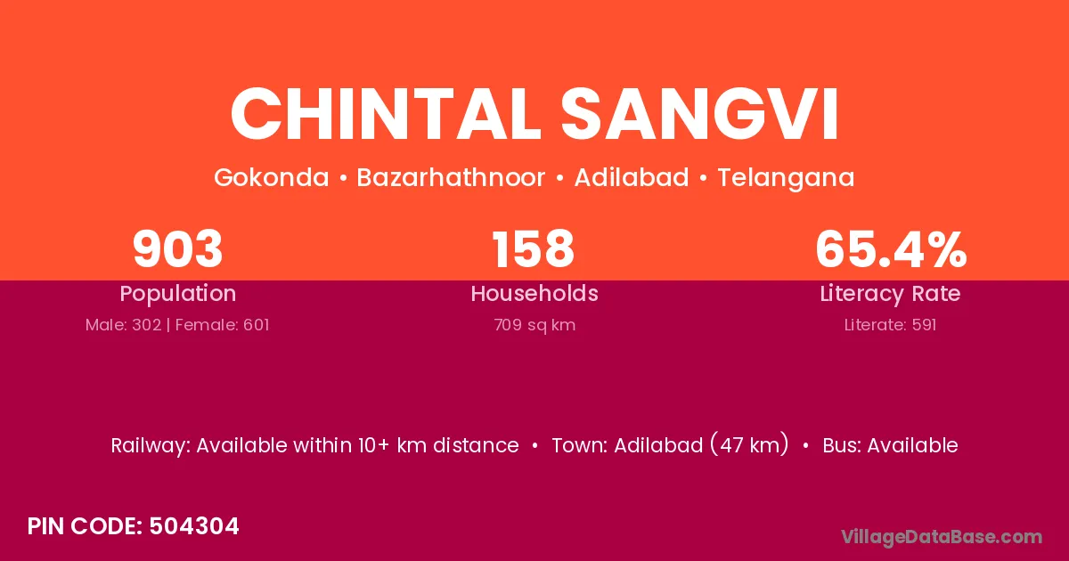 Adilabad (47 km) is the nearest town to Chintal Sangvi village for major economic activities and is located approximately 47 km away.