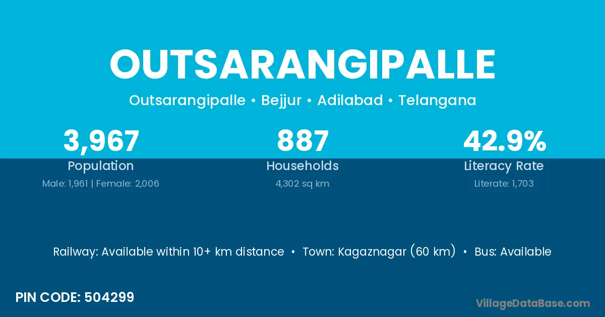 Kagaznagar (60 km) is the nearest town to Outsarangipalle village for major economic activities and is located approximately 60 km away.
