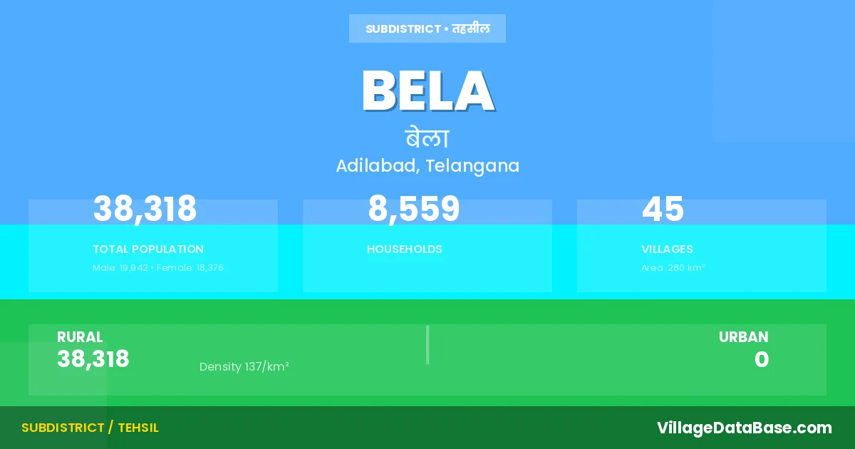 Bela is a town and Mandal in the Adilabad district of the Telangana. In India, a Mandal is a subdivision of a district responsible for the administration and revenue collection of a specific area within the district. Mandals play a crucial role in the local governance structure, contributing significantly to the development and administration of their communities.