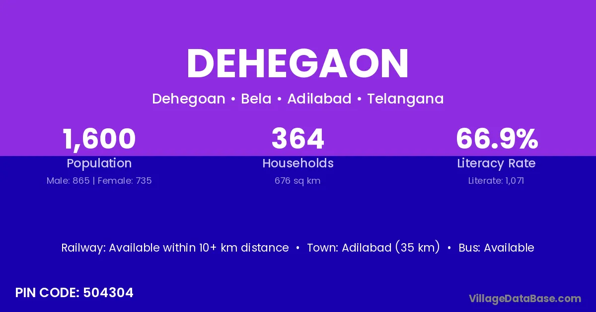 Adilabad (35 km) is the nearest town to Dehegaon village for major economic activities and is located approximately 35 km away.