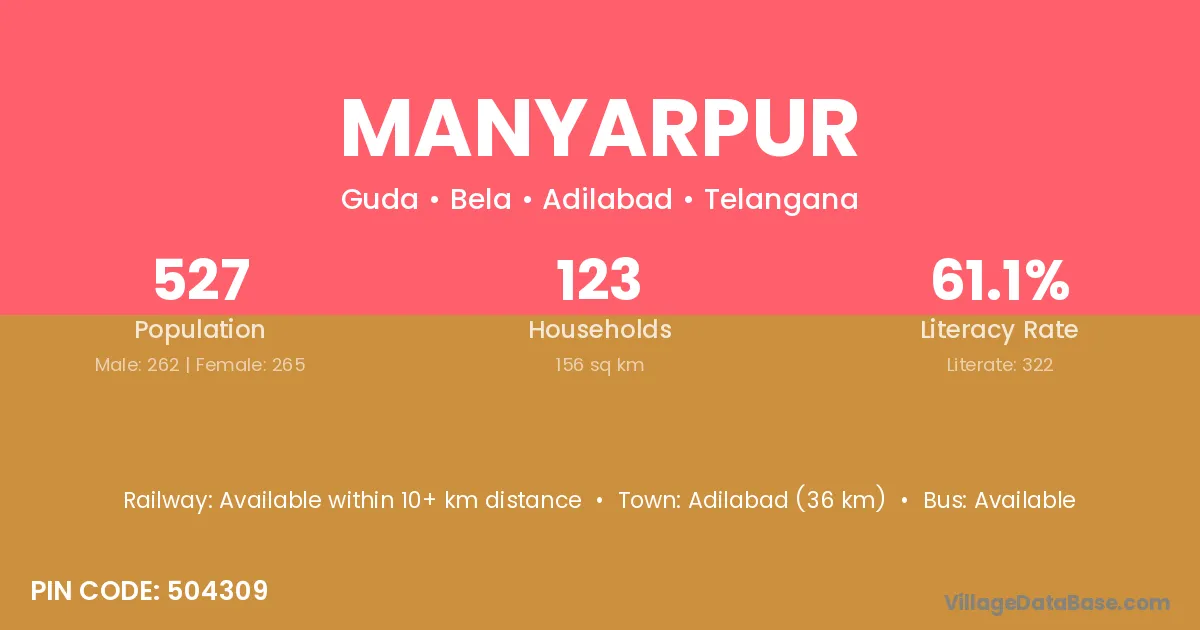 Adilabad (36 km) is the nearest town to Manyarpur village for major economic activities and is located approximately 36 km away.