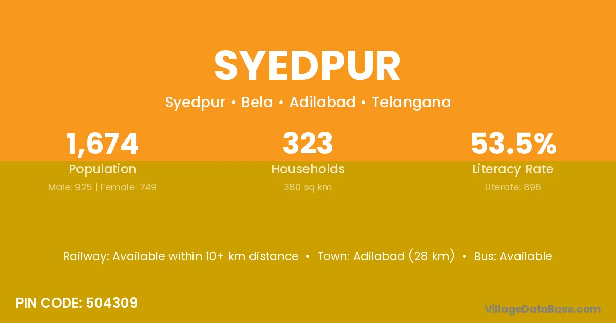 Adilabad (28 km) is the nearest town to Syedpur village for major economic activities and is located approximately 28 km away.