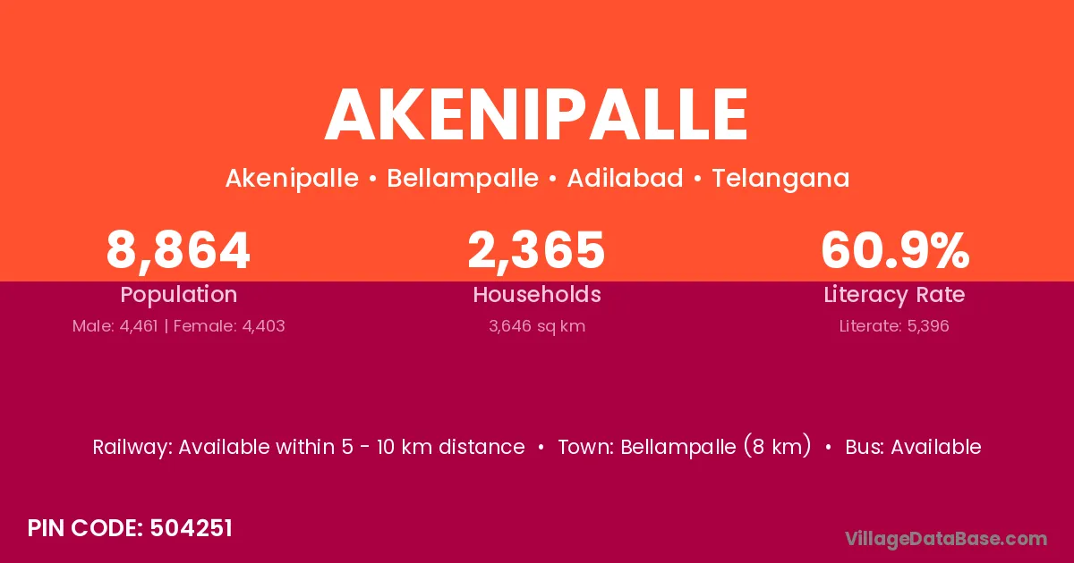 Bellampalle (8 km) is the nearest town to Akenipalle village for major economic activities and is located approximately 8 km away.