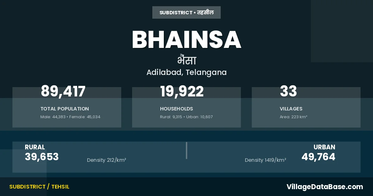 According to the 2011 census The total area of Bhainsa Mandal is 223 km², with a population of 89417 people. The population density is 402 inhabitants per square kilometre, and there are approximately 19922 houses in the sub district.