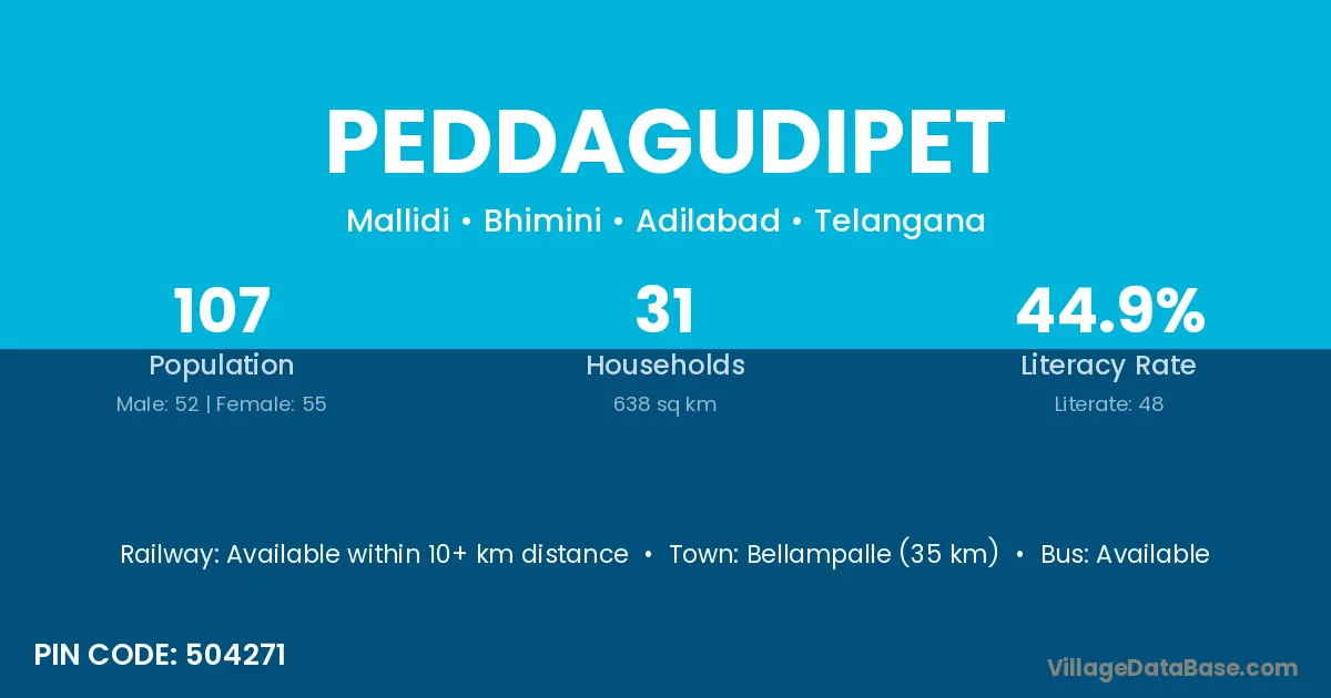 Bellampalle (35 km) is the nearest town to Peddagudipet village for major economic activities and is located approximately 35 km away.